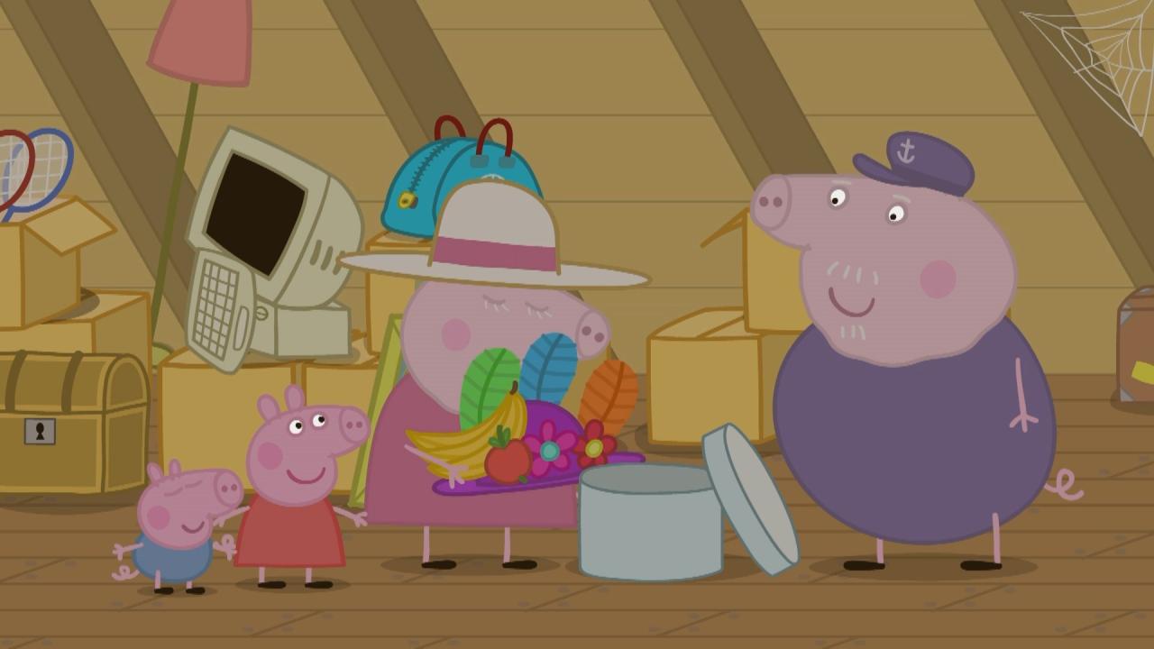 Peppa a George sa snažia zbaviť vecí z povaly babičky a dedka Prasiatka.